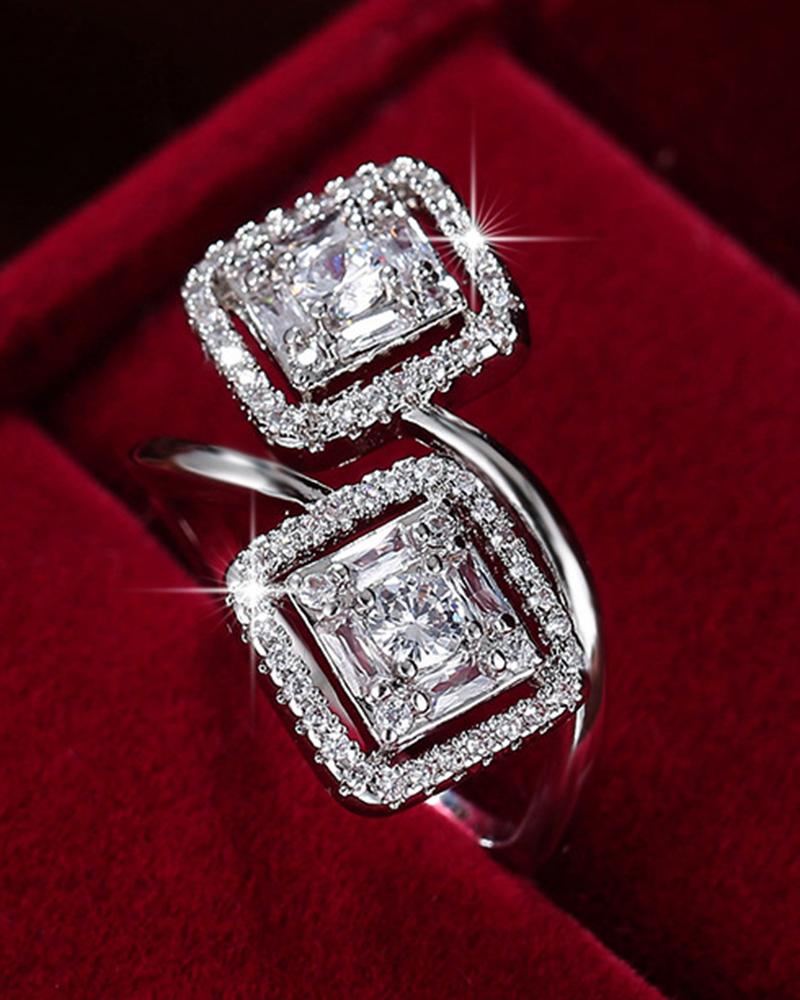 1pc Rhinestone Double Square Opening Ring, Silver