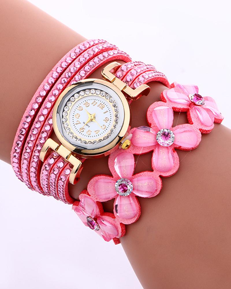 1pc Rhinestone Floral Pattern Stackable Bangle Quartz Watch, Pink