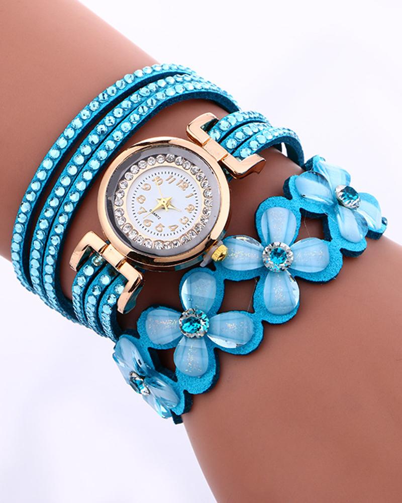 1pc Rhinestone Floral Pattern Stackable Bangle Quartz Watch, Turquoise blue