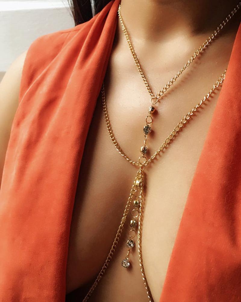 1pc Rhinestone Tassel Layered Beach Bra Chain, Gold