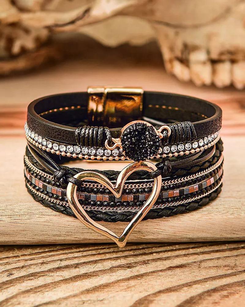 1pc Tribal Multi-layer Heart Pattern Rhinestone Magnet Wide Bracelet, Black