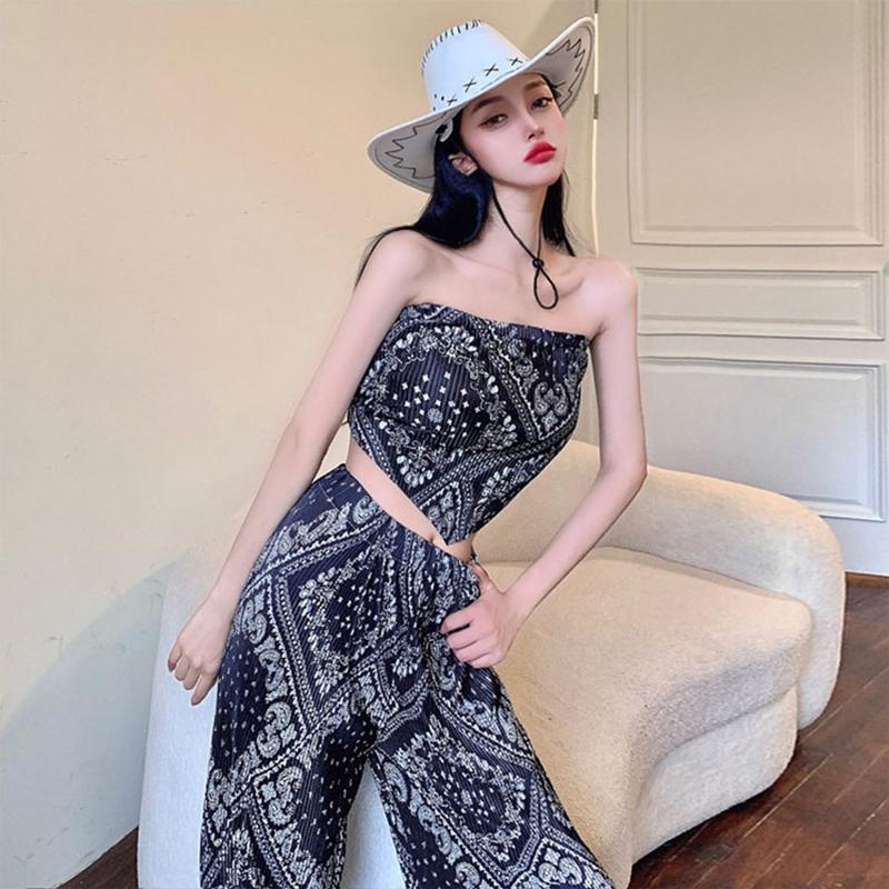 2 шт / комплект Женские наряды Ретро Синий Белый Фарфор Печать Треугольник Живот трубка Топ Широкие ноги Брюки Костюм