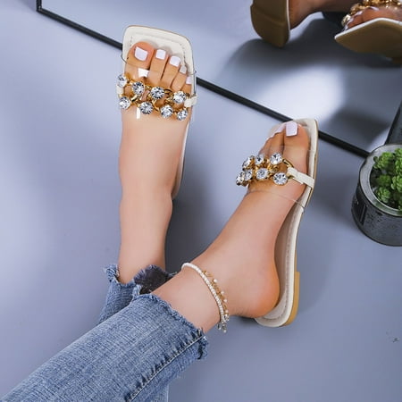 ãYilirongyummã Beige 41 Slippers For Women Ladies Fashion Solid Color Transparent Rhinestone Open Toe Chain Flat Sandals