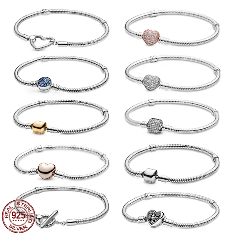 Лидер продаж, браслет из серебра 925 пробы с блестящим сердцем, классический женский браслет, подходящий для оригинальных шармов, бусины «сде...