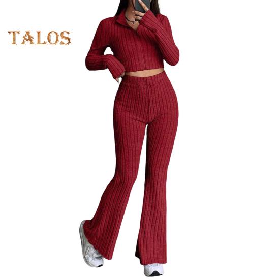 2 шт./комплект женский весенний наряд для поездок на работу топ расклешенные брюки комплект застежка-молния воротник стойка пальто высокая талия спортивный костюм эластичная повседневная одежда M вино красного