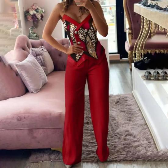 2 шт./компл., женский топ, брюки, костюм, ремень-цепочка с открытыми плечами, пуговицы, декор, соответствующий цвет, V-образный вырез, открытая спина, без рукавов, приталенный крой, прямые, широкие штаны, OL, для поездок на работу