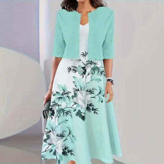 2 шт./компл., женское пальто, юбка, костюм с цветочным принтом, ТРАПЕЦИЕВИДНОЕ, с V-образным вырезом, без рукавов, на молнии сзади, платье с длинным рукавом, сплошное цветное пальто, OL, коммутирующий стиль, весна-осень