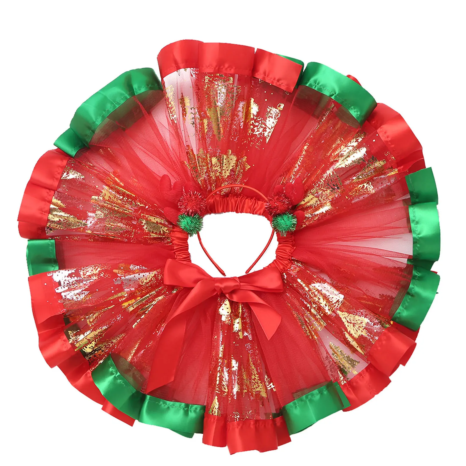 Kids Girls Christmas Costume Xmas Elves Dress Glittering Christmas Tree Print Mesh Tutu Skirt with Hair Hoop for New Year Party