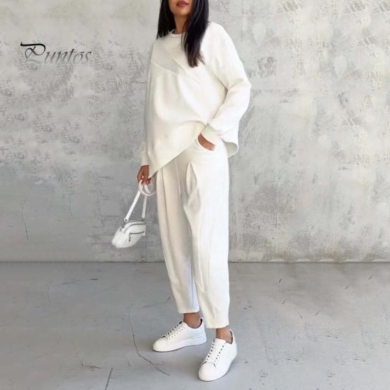2 шт./компл. осень-весна женские верхние брюки комплект с длинными рукавами и круглым вырезом нерегулярная футболка брюки с эластичной резинкой на талии и боковыми карманами OL спортивный брючный костюм для поездок на работу L чёрный