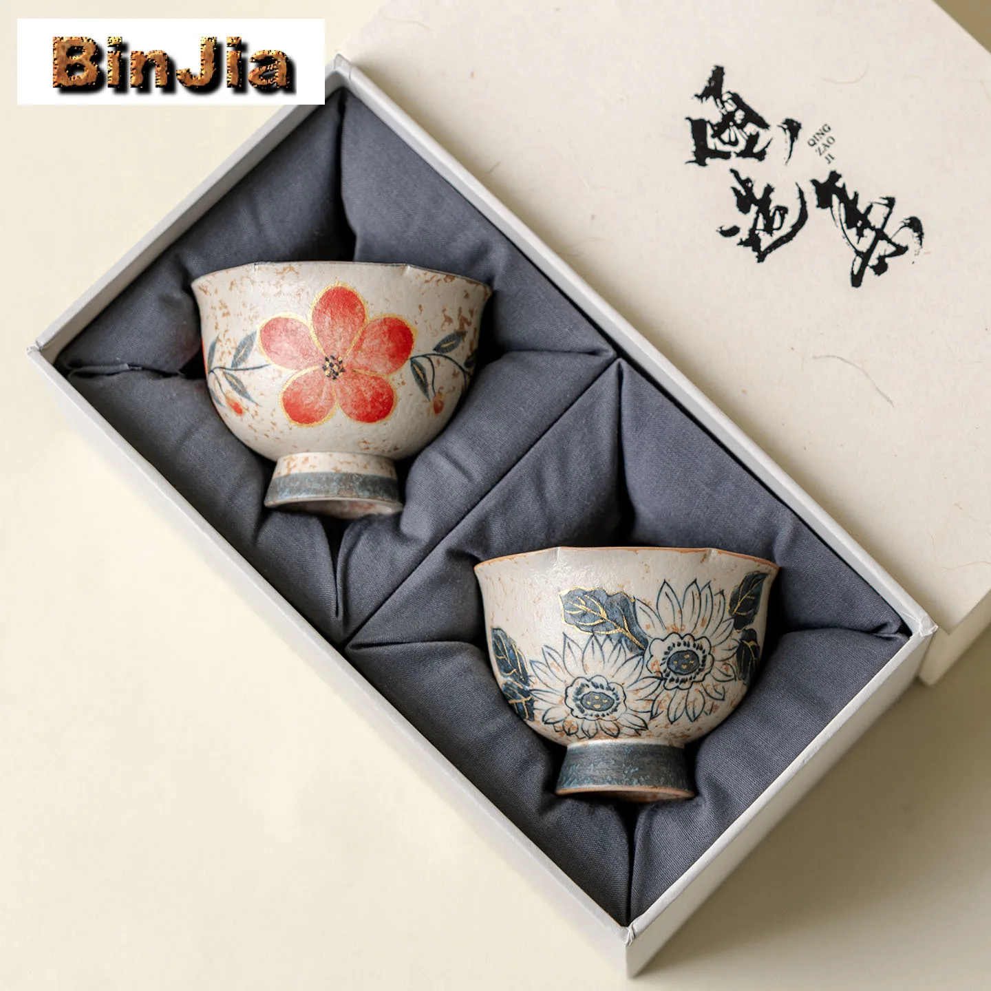 2 шт./компл., ручная роспись, розовая персиковая чашка с подсолнухом, антикварная чайная чаша, чайная пара, чашка для медитации, чашки для медитации Jianzhan Master, ремесло