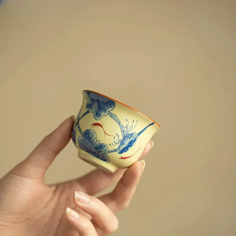 2 шт./лот Ru Kiln Желтая рыба играет в пруду лотоса Чайная чашка Винтажная чайная чаша Кружка для дегустации чая Ароматная чашка Jianzhan Master Cup 70 мл