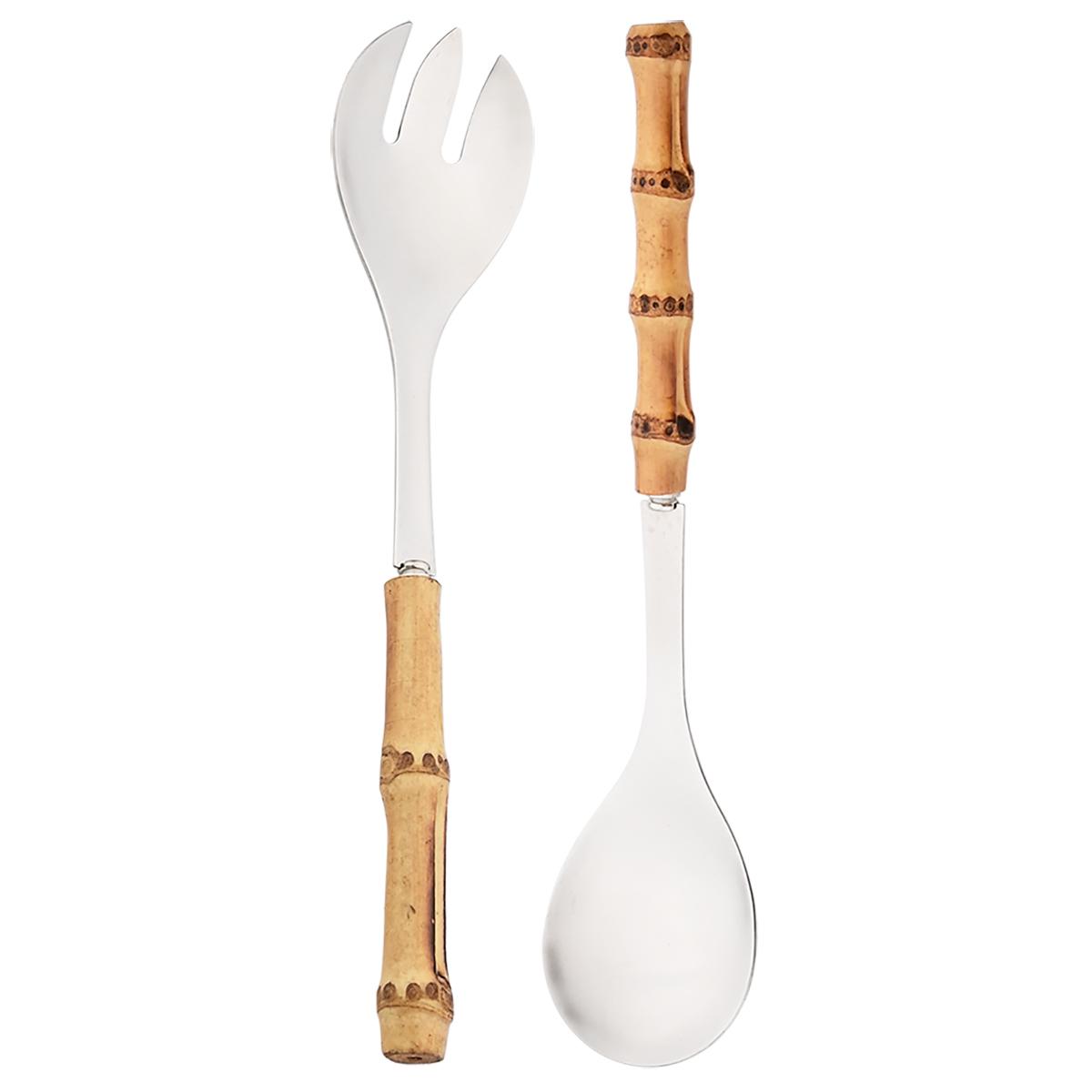 2 шт./набор Бамбуковая деревянная ручка Большая ложка с отверстиями Нержавеющая сталь Столовые приборы Длинная ручка Сервировочная ложка Вилка Набор кухонных столовых приборов