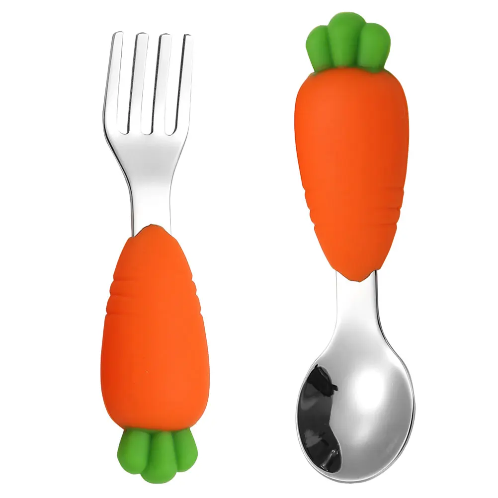 2 шт., набор детских ложек и вилок, посуда для самостоятельного кормления для малышей, силиконовая ручка, нержавеющая сталь, мультяшная морковь, детское серебро, детское серебро