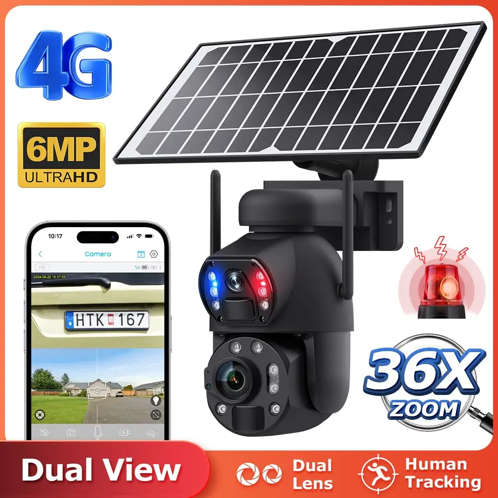 Камера безопасности на солнечной энергии для улицы, двойной объектив 4G/WiFi, зум 20x/36x, разрешение 6 МП, обнаружение человека PIR, цвет + ИК-ночное видение