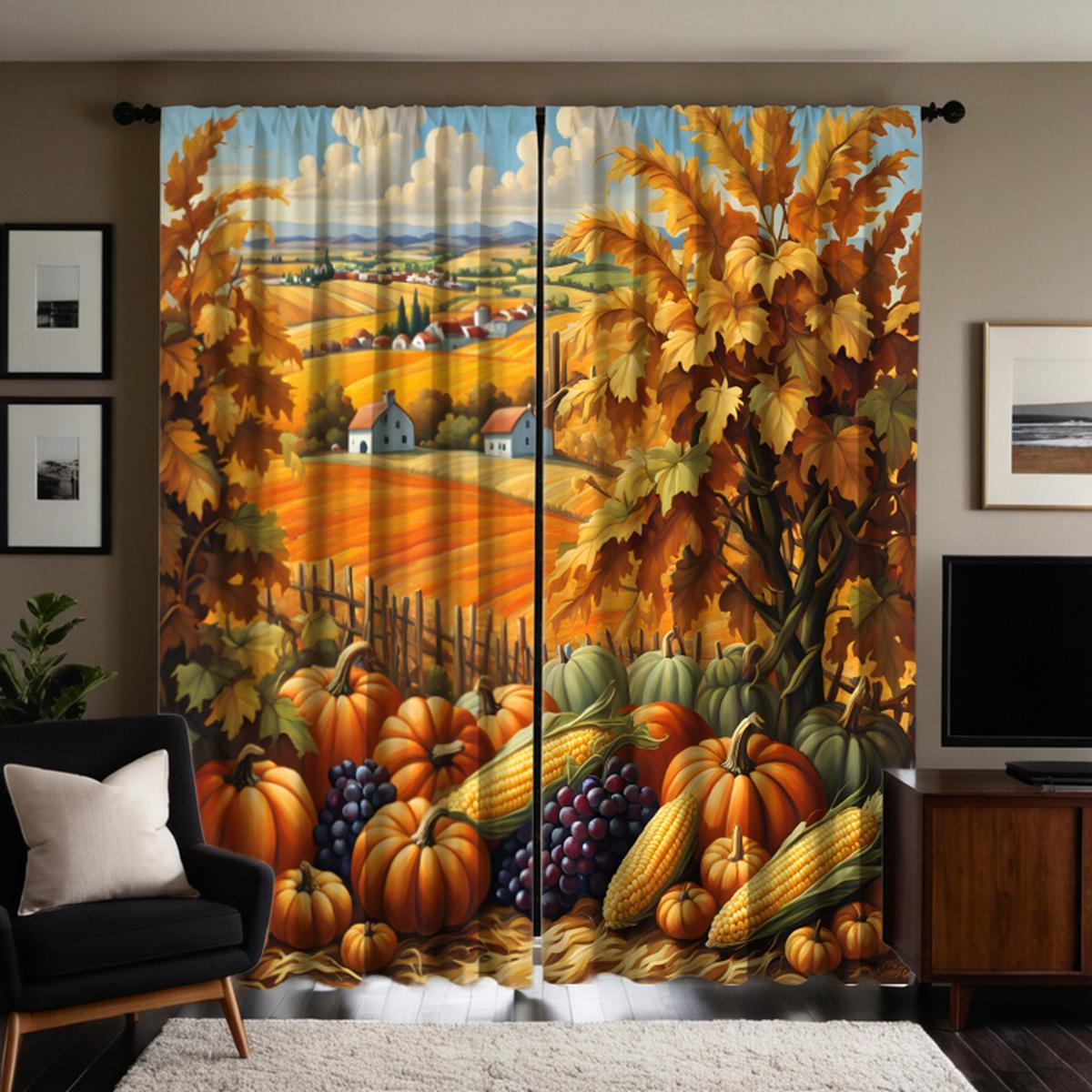 2 шт. HD Праздник урожая Идиллический сельский городок Кленовый лист тыква фрукты занавеска Зеленая завязка цифровая печать занавеска Домашний декор W52H63inchW132H160cm