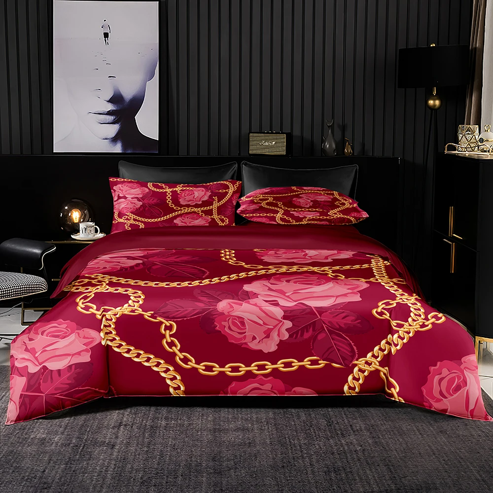 2/3 комплекта, розовый комплект постельного белья, роскошный европейский стиль, золотая цепочка с романтическим принтом розы, пододеяльник, ...