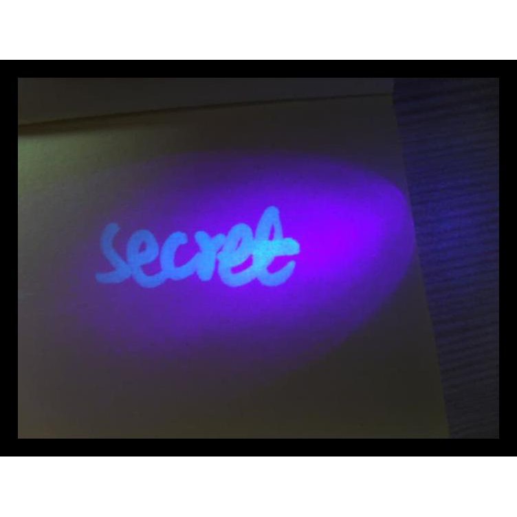 Pen dengan tinta invisible. Bagian tutupnya terdapat senter cahaya ultra violet yang berfungsi untuk melihat hasil tulisannya. Tanpa sinar tsb, tulisan tidak akan terlihat. Dapat ditulis semua bidang seperti kertas, plastik, lantai, di kulit ,dll. Tulisan akan sangat jelas terlihat jika terkena cahaya senter ultra violetnya bahkan di siang hari. Dengan Pen ini Anda dapat menuliskan pesan rahasia tanpa terlihat.