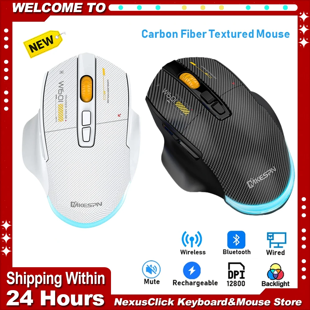 2.4G Wireless Bluetooth Wired Tri-mode Mouse 12800DPI Mute Macro Programming Game Rechargeable Carbon Fiber Texture Mice Backlit
