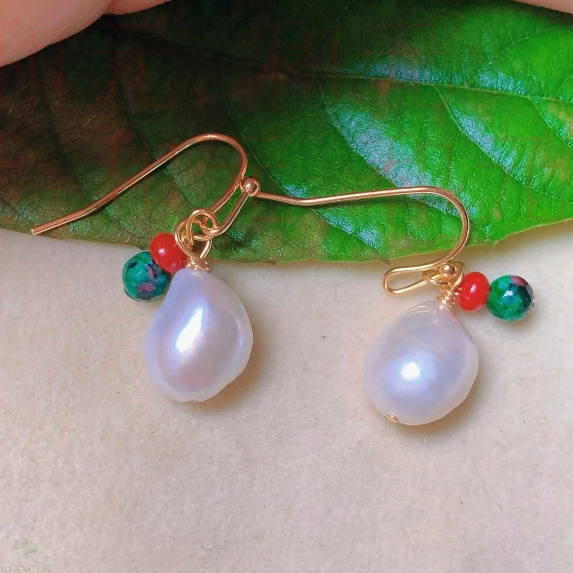 Natural white freshwater baroque pearl South red beads gold earrings Gift Women VALENTINE'S DAY Ear stud Hook Thanksgiving