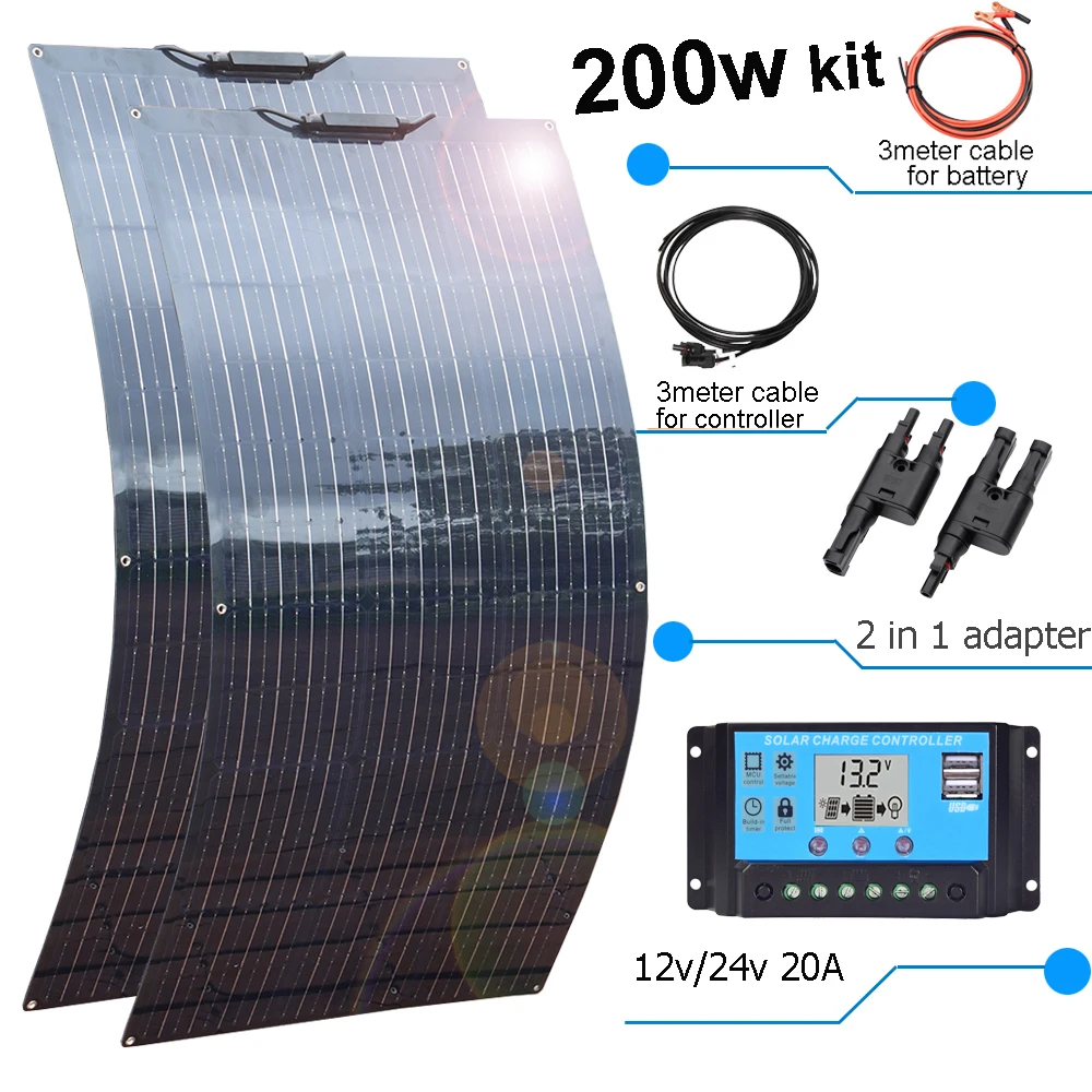 200W Solar Panel Starter Kit 2PCS 100W Mono Module 20A Charge Controller 12V for RV Boats, Trailer Camper,Cabin Off-Grid System