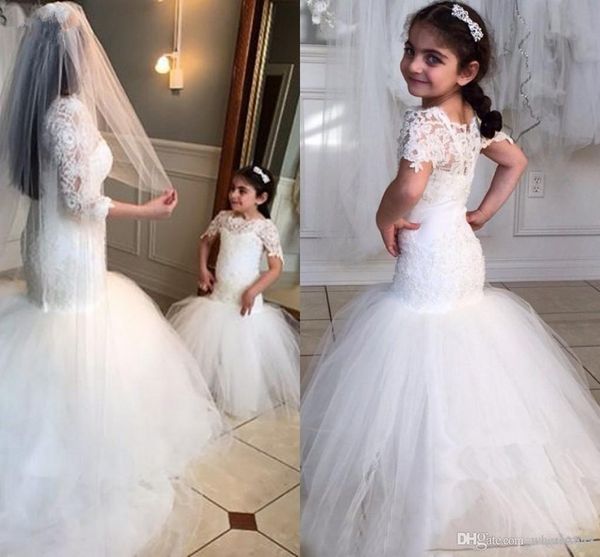 2016 белые кружева цветочные платья для девочек для свадьбы красоты с короткими рукавами русалка девушка день рождения платье труба маленьки, White;blue