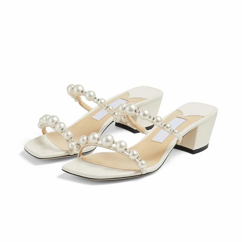Famous Summer Women Sandals Pumps Popular AMARA 45 mm Italy Luxury Pearls Double Ankle Strap Calfskin Embellished Trendy Slingback Sandal High Heels EU 35-43