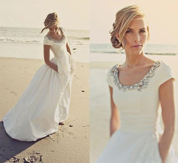 2018 пляжные свадебные платья дешевые укупоренные рукава горный хрусталь совок шеи свадебные платья с карманами длинное платье линии, White