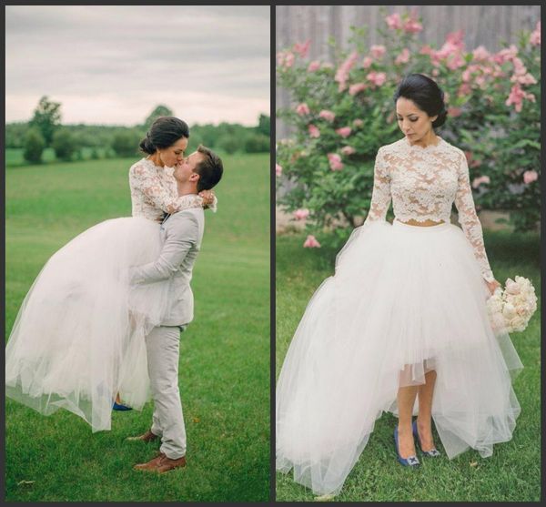 2019 высокие низкие кружевные свадебные платья с высокой шеей платья с длинными рукавами тюль слои иллюзия платья из двух частей дешевые, White