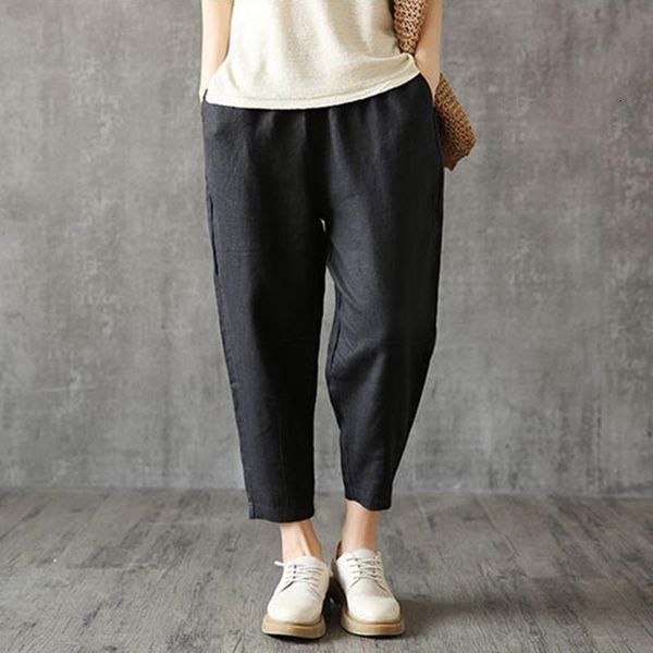 2019 ретро хлопчатобумажные бельевые брюки женские плюс размер весна осень девять брюк свободных брюк капризов карманы твердые штаны, Black;white