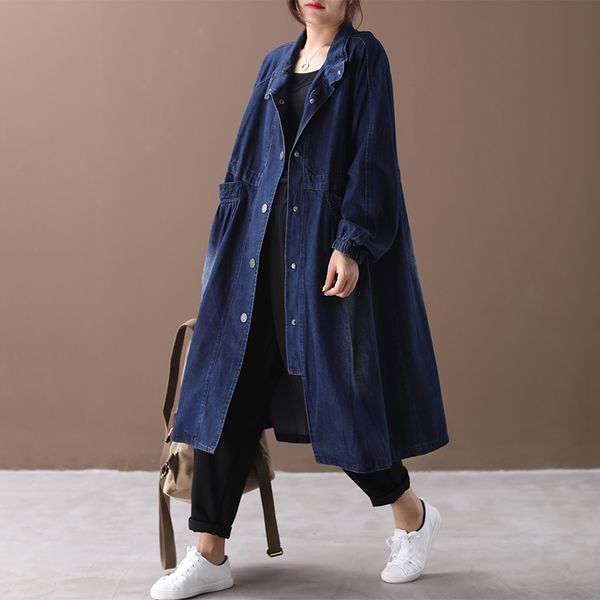 2020 женский новый осень корейский стиль плюс размер верхняя одежда литературный однобортный промытый слой свободная джинсовая траншея, Tan;black