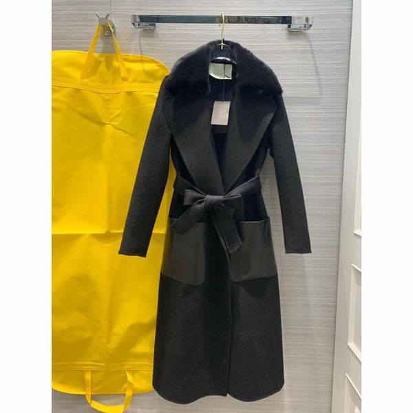 2020 зима высокого класса 100% шерсть черное пальто женщины реальный мех отворотом воротник тонкий пояс длинный жакет офис леди формальное п, Black