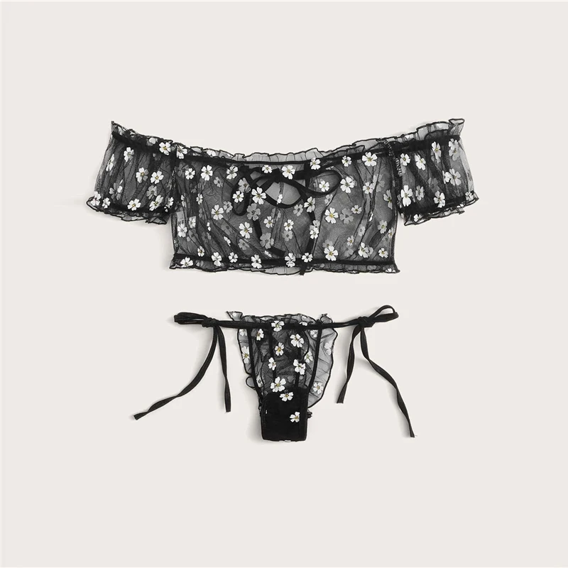 2020 прозрачная ночная сорочка, Прозрачные топы и стринги, черные сетчатые сексуальные комплекты нижнего белья с цветочным принтом для женщи...