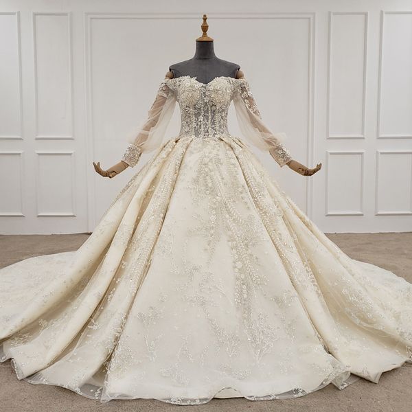 2020 boho свадебное платье с поезда милая плеча блесток бисероплетение аппликация с длинным рукавом кружева бальное платье свадебное платье, White