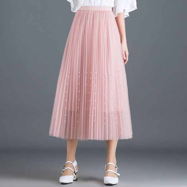 2020 newspring летние юбки женские бисероплетение сетки тюль юбка женщины эластичная высокая талия линия середины икры миди длинная плиссиро, Black