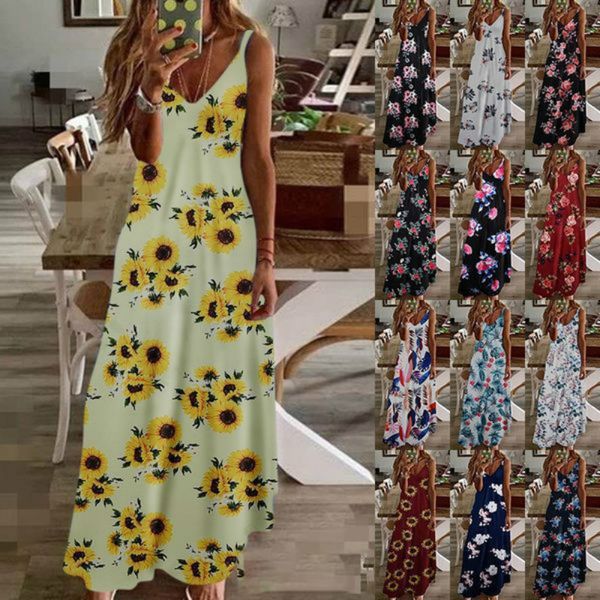 2020new женская мода лето без рукавов печати слинг платье свободные платья вскользь длинные maxi платья дамы плюс размер партии dre, White