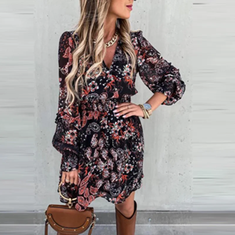 2021 Весенняя винтажная Цветочный принт мини платье женское элегантное платье с v-образным вырезом офисные платья летнее Пышное Платье с длин...
