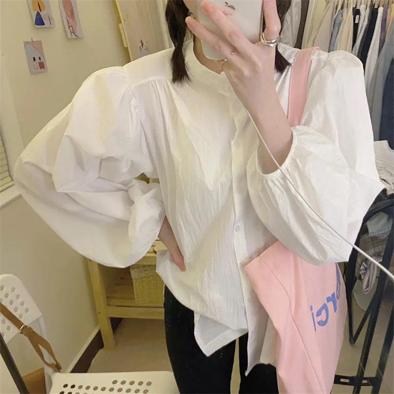 2021 Весенняя свободная простая Базовая рубашка в Корейском стиле с рукавами-фонариками Элегантная Модная Однотонная рубашка универсальная ...