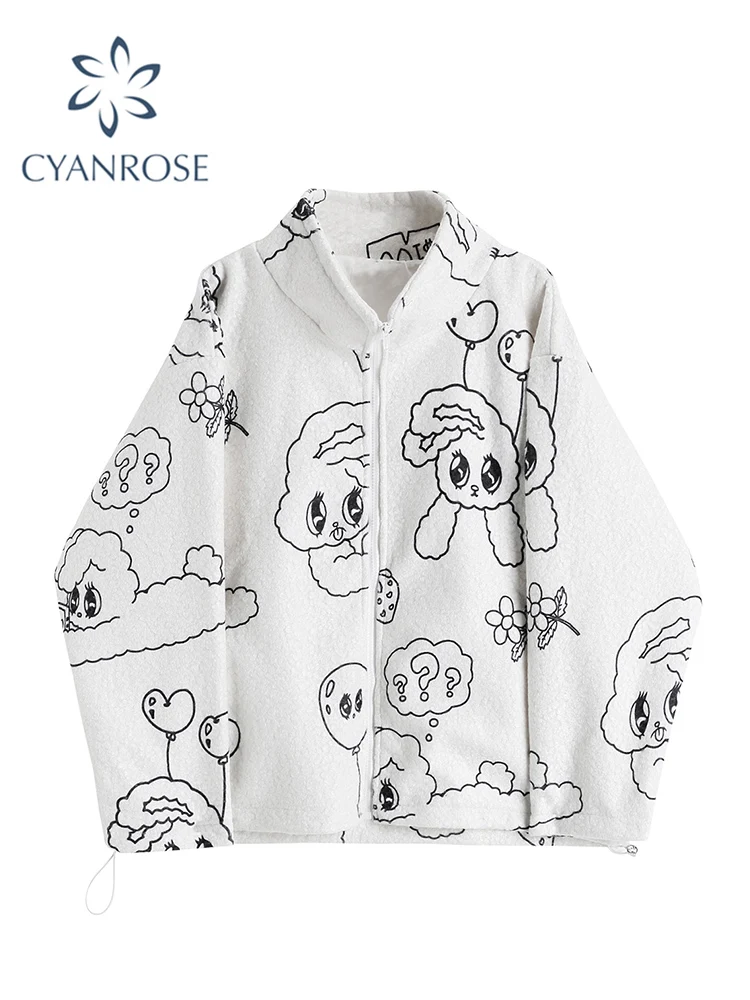 2021 Женская милая куртка из овечьей шерсти с мультяшным принтом, корейское винтажное флисовое пальто, Зимняя мода, милые теплые куртки, Женск...