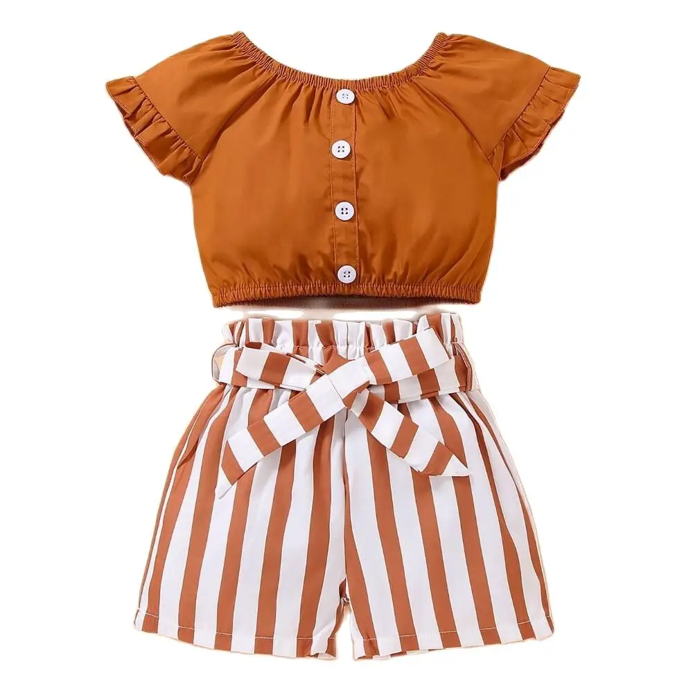 2021 Летняя одежда для малышек модное платье Комплекты одежды с открытыми плечами топы и шорты в полоску, комплект со штанами комплект От 2 до 5...