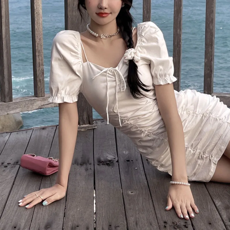 2021 Модное Элегантное Белое Женское мини-платье с пышными рукавами и V-образным вырезом, летнее милое Привлекательное платье во французском ...
