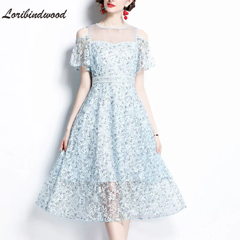 2021 Новое модное кружевное открытое летнее платье, женское синее Сетчатое платье с круглым вырезом в стиле пэчворк, элегантные вечерние плат...