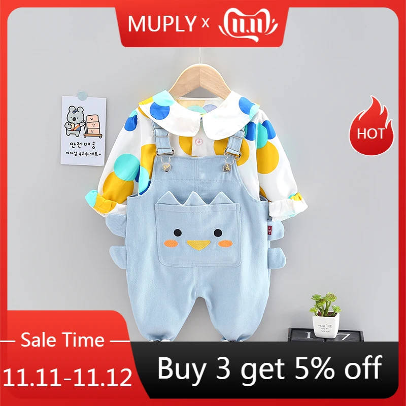 2021 г. Осенняя одежда для девочек, кукольная рубашка с воротником, милая рубашка в горошек + штаны на бретелях Одежда для маленьких девочек од...