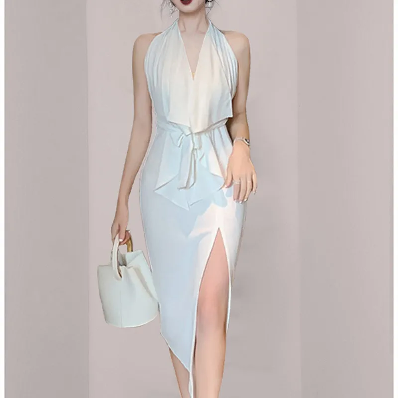 2021 летнее Новое Стильное винтажное элегантное однотонная Дамская обувь женская одежда до колена Длина Разделение Lrregular с открытой спиной на шнуровке вечерние платья