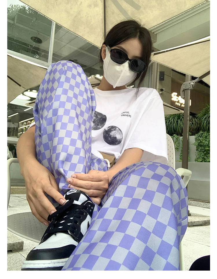2021 летние простые клетчатые повседневные брюки для девочек в стиле ретро, женские брюки, уличная мода, прямые тонкие повседневные женские б...