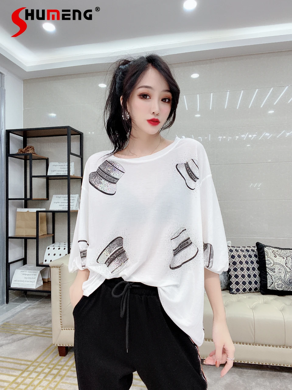 2021 летняя шляпа с принтом со стразами свободного кроя с рукавами «летучая мышь» женские футболки для девочек Ins личность размера плюс футбо...