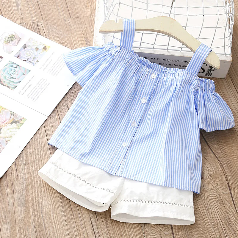 2021 модная новинка; Для детей 2, 3, 4, 11 и 12 лет, простое хлопковое платье в полоску с открытыми плечами; Ремешок: футболка + шорты, комплект из 2 пр...