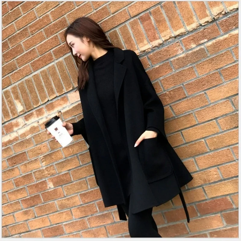 2021 черные толстые плюшевые пальто из смесовой ткани, женская элегантная однотонная Длинная Верхняя одежда с поясом, Повседневная коммутаци...