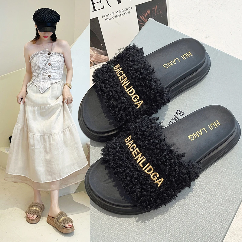 2022 Модные женские тапочки на плоской подошве осень-зима однотонные уличные плюшевые тапочки открытые чай овечья шерсть женская обувь с выш...