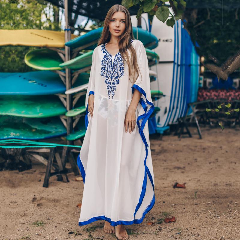 2022 Накидка на бикини с v-образным вырезом и вышивкой по бокам, шифоновая свободная длинная юбка, повседневная одежда с рукавами «летучая мышь», пляжный купальник большого размера, накидка Q746 One Size белый