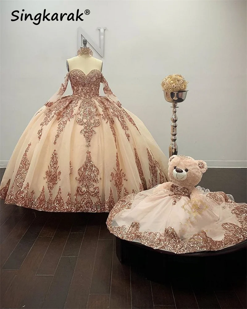 2022 блестящее бальное платье цвета шампанского, платья для Quinceanera со съемными рукавами, милое платье с блестками и аппликацией, праздничная о...